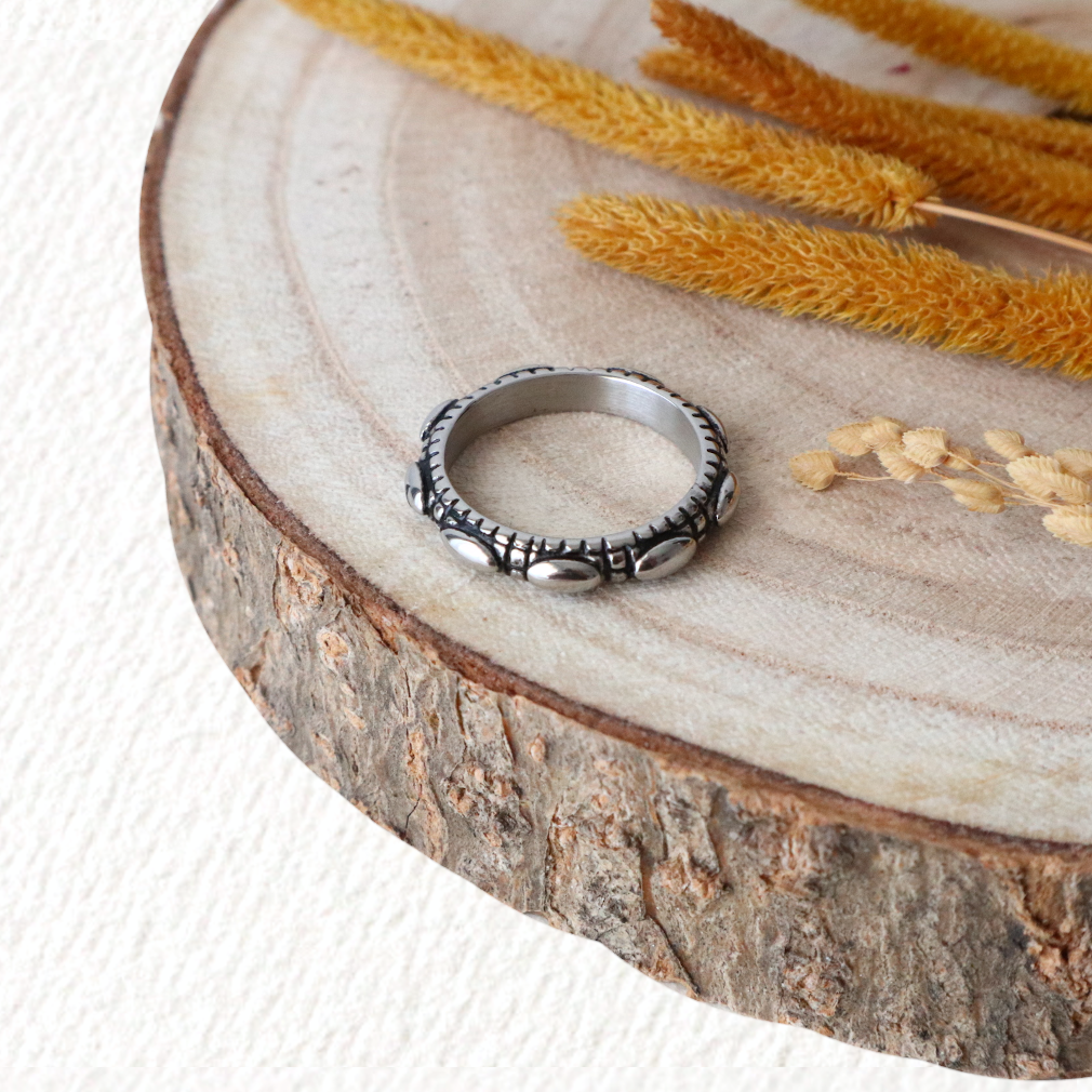 ANILLO BOHO ANGKOR. Anillo de acero, de estilo boho, en tono plateado con grabado en forma de círculos. No es ajustable por lo que se debe elegir la talla del producto.