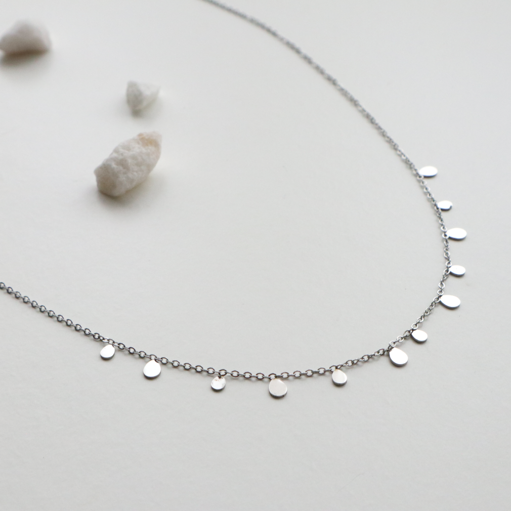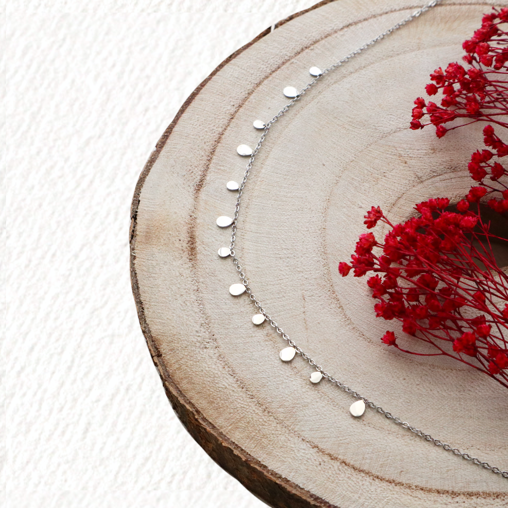 COLLAR LÁGRIMAS PLATEADO MORAINE. Collar fino de acero, en tono plateado, de estilo gargantilla con mini colgantes en forma de lágrimas. Cierre ajustable de mosquetón.