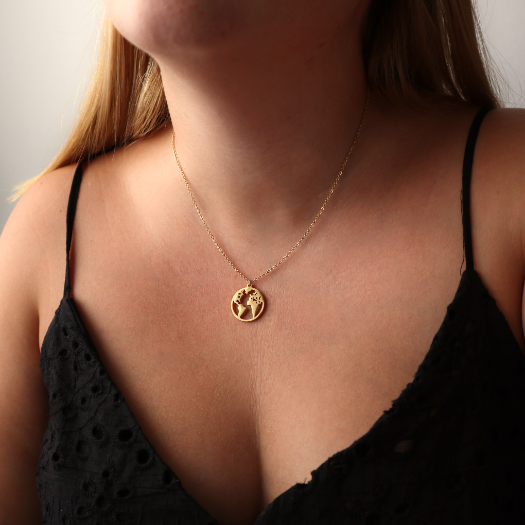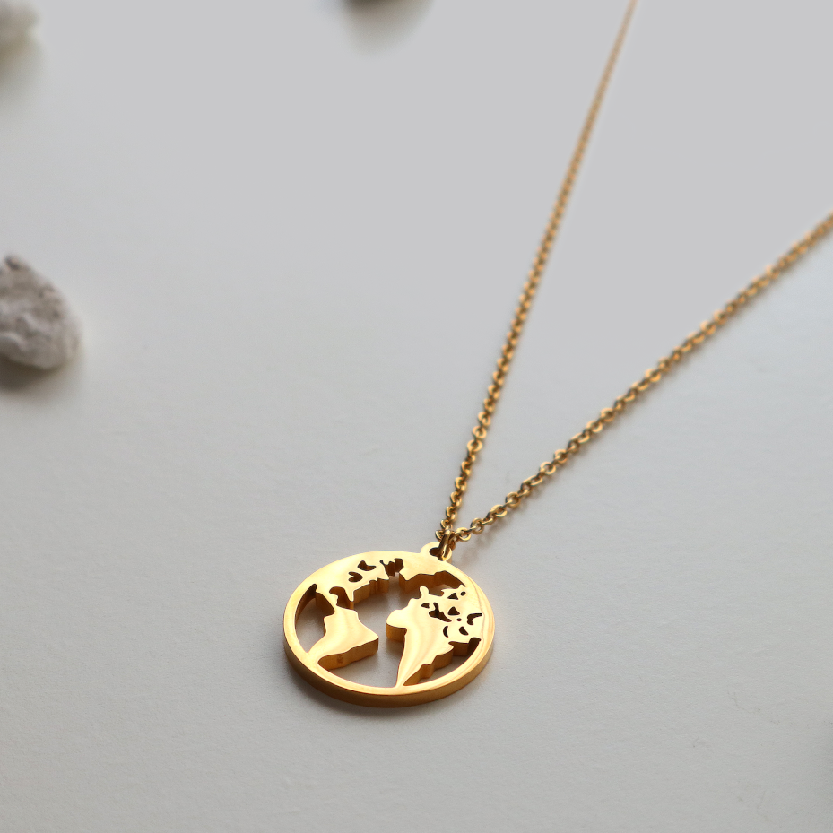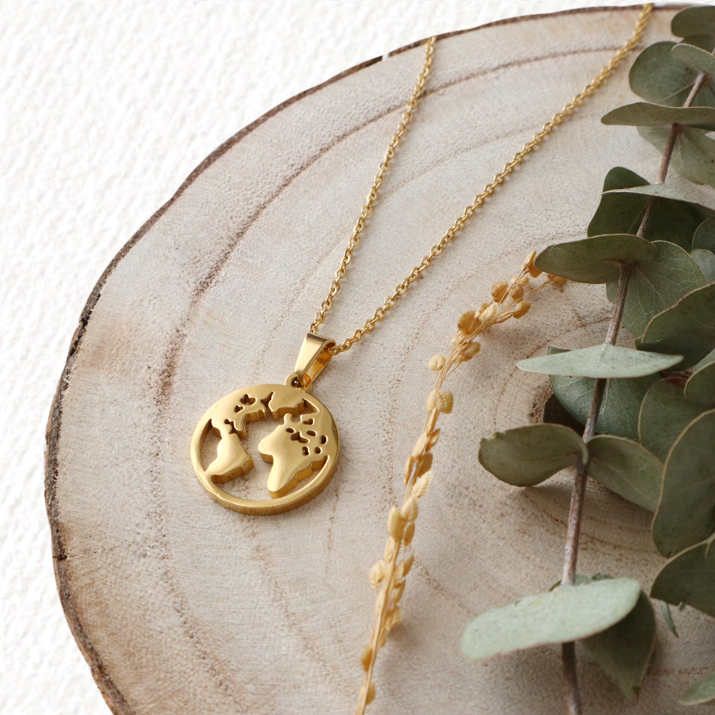 COLLAR MAPAMUNDI BABEL XL DORADO. Collar dorado, con colgante en forma de mapamundi de tamaño grande. Se abrocha fácilmente gracias a su cierre de mosquetón. Su material es de acero inoxidable.