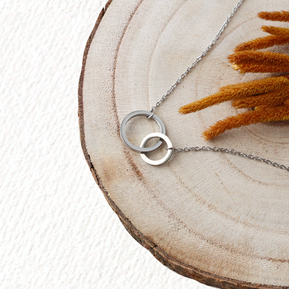 COLLAR PLANO AROS PLATEADO GELDROP. Collar con colgante plano en forma de dos aros entrelazados en tono plateado. Se abrocha fácilmente gracias a su cierre de mosquetón. Su material es de acero inoxidable.