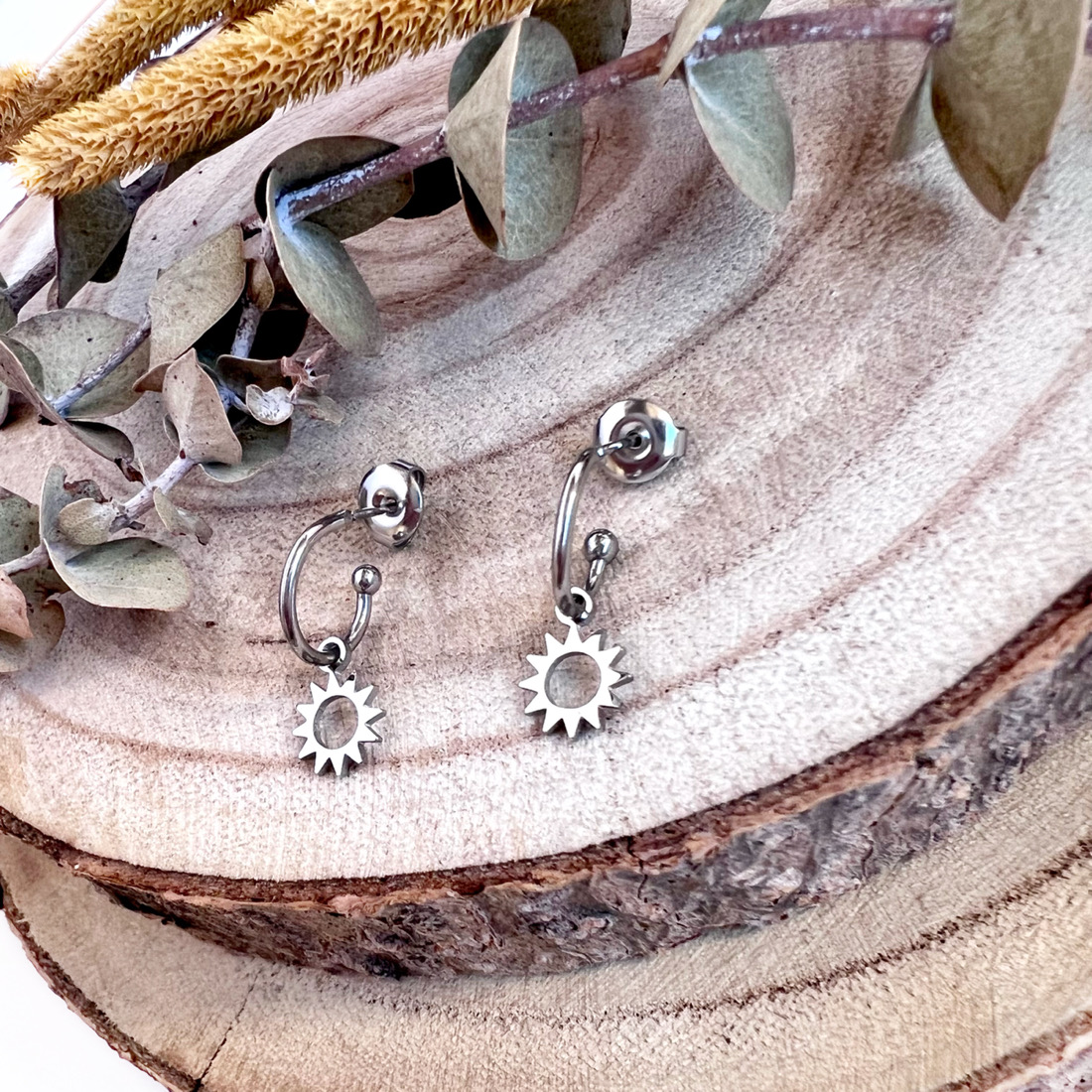 PENDIENTES ARO COLGANTE SOL FEZ: Pendientes de acero, plateados, de aro y con colgante en forma de sol. Cierre de tuerca.
