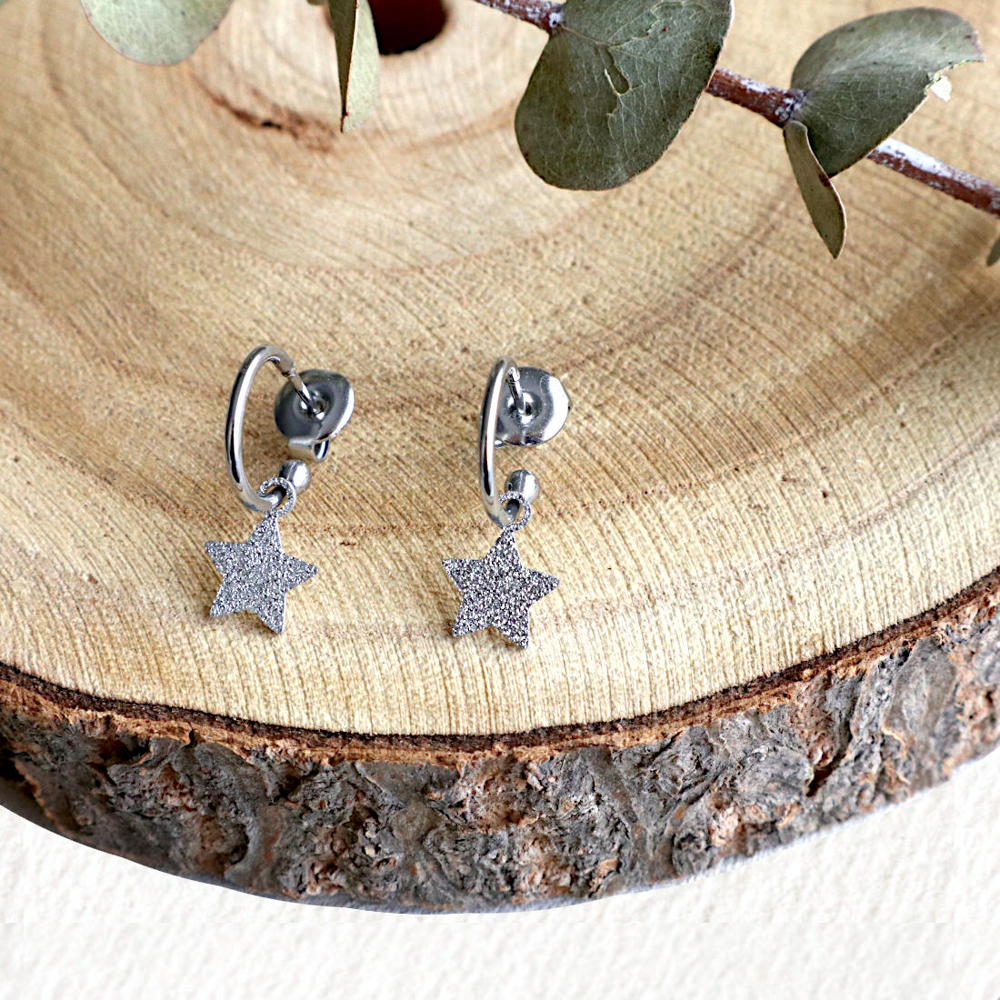 PENDIENTES EFECTO PURPURINA WAITOMO SPARKLE: Pendientes de acero, plateados, con efecto purpurina, de aro y con colgante en forma de estrella. Cierre de tuerca.