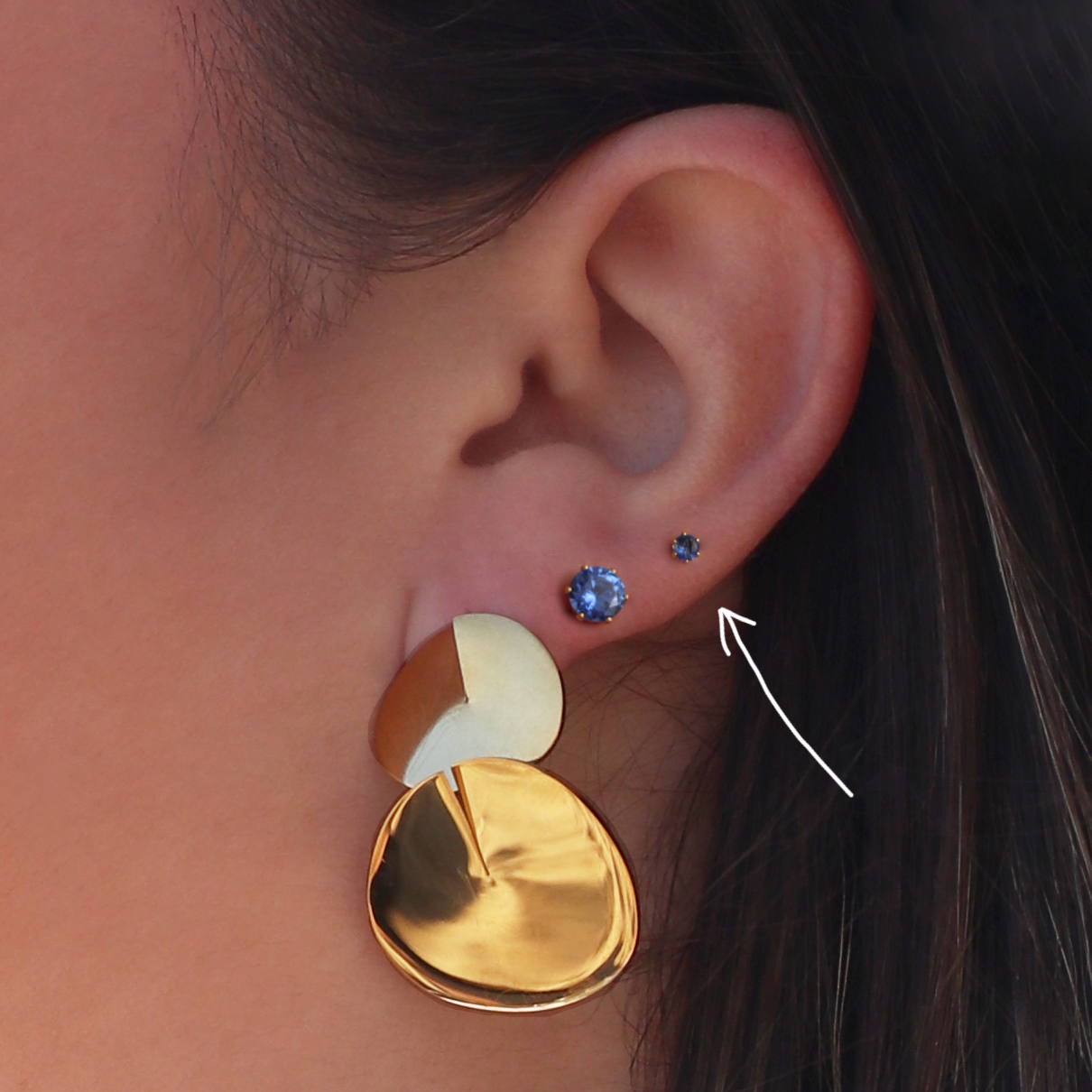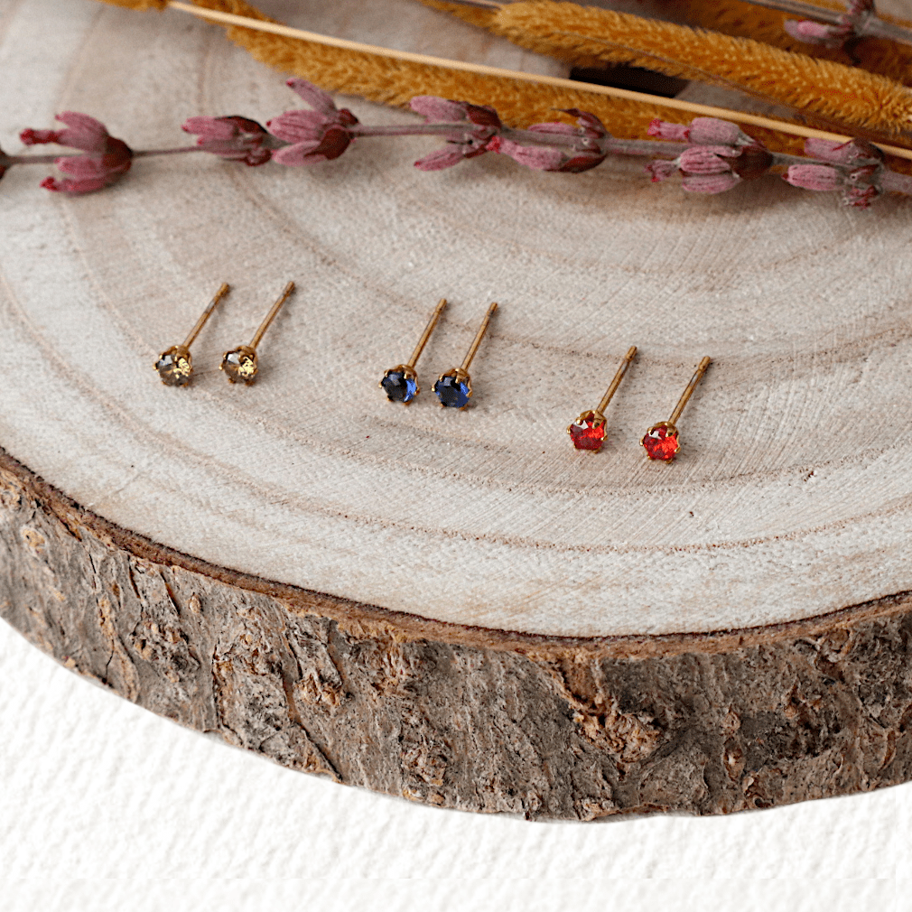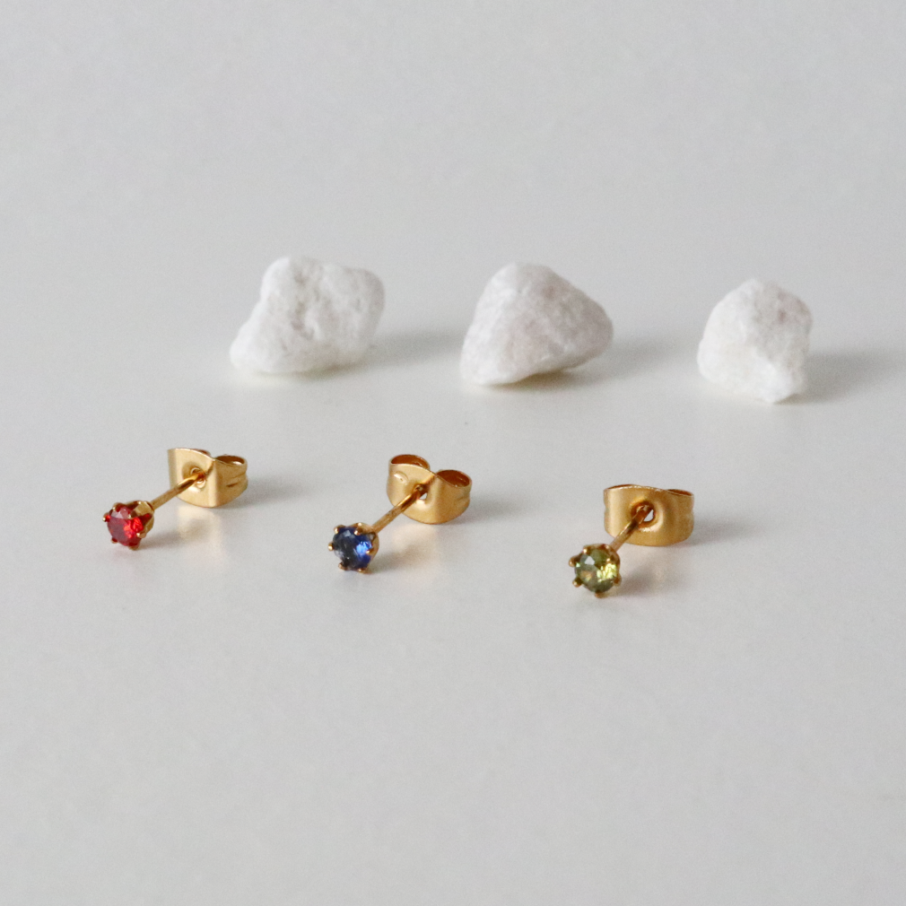 PENDIENTES COLORES MINI RAINBOW. Pendientes de acero dorado y de tamaño pequeño, con piedra engarzada en tono rojo, azul o verde. Muy recomendados para los agujeros secundarios del lóbulo aunque también quedan preciosos en el agujero principal. Puedes elegir comprarlos sueltos o en par.