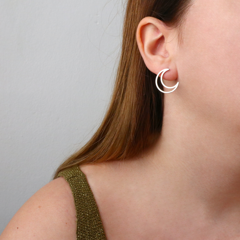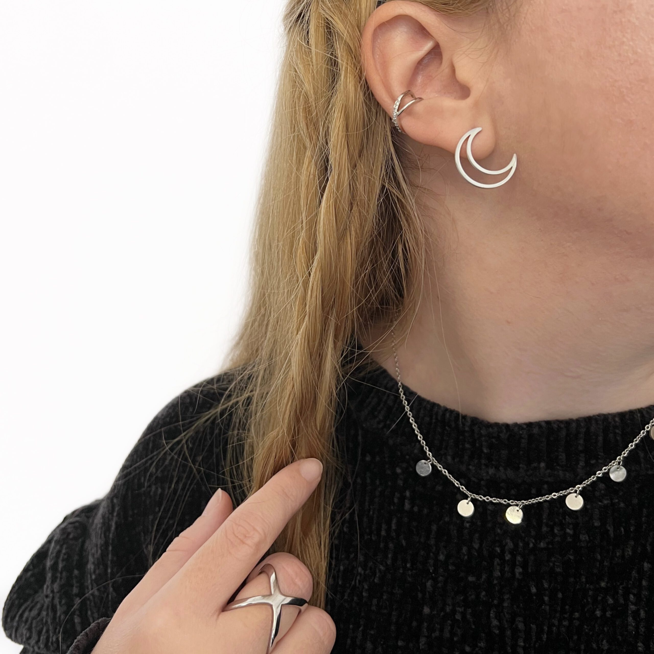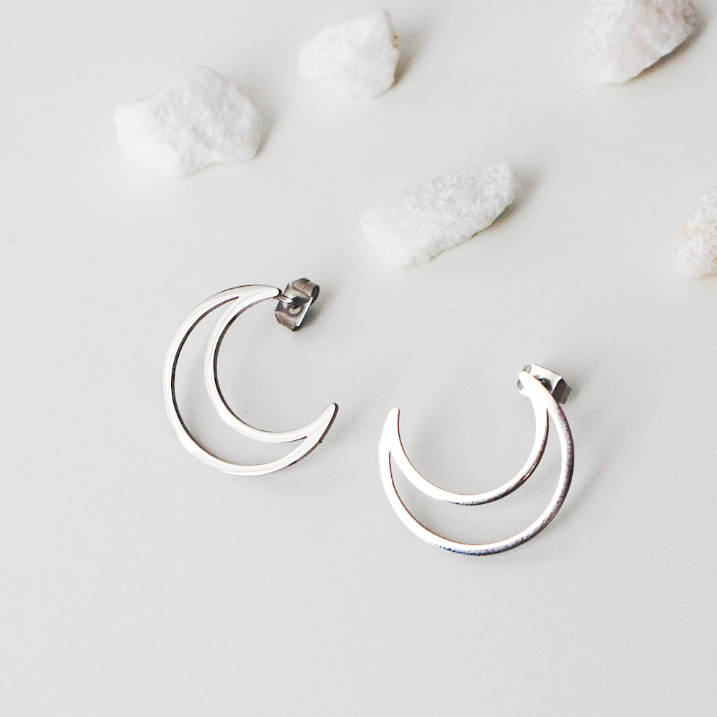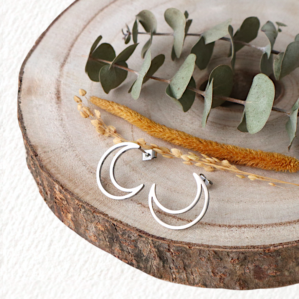PENDIENTES SILUETA LUNA SINTRA. Pendientes de acero, en tono plateado y de tamaño grande, en forma de silueta de media luna.