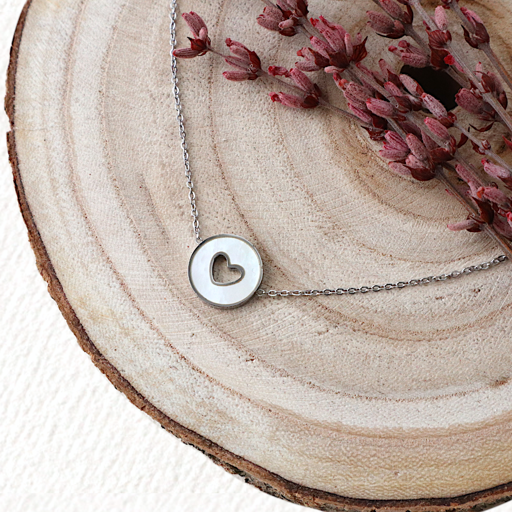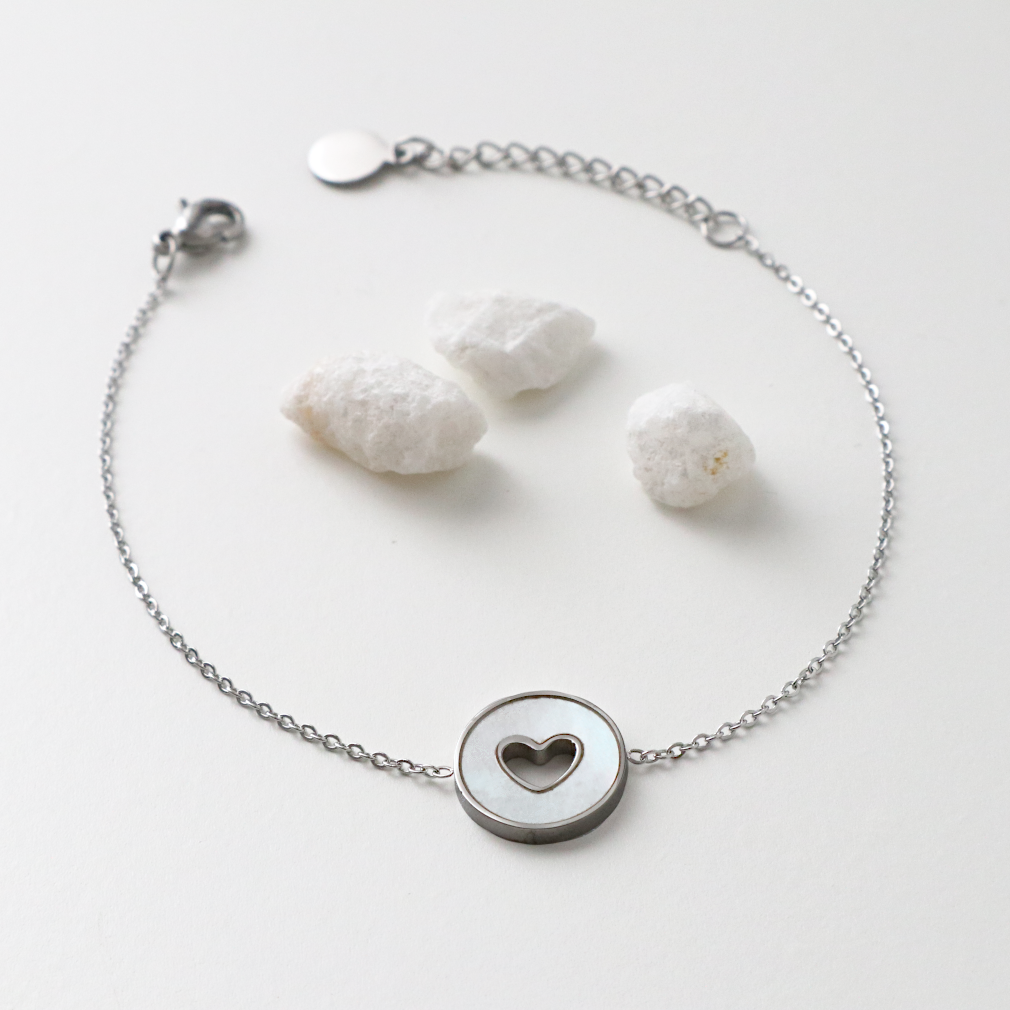 PULSERA CORAZÓN HUECO ROMA. Pulsera de acero, plateada, con colgante con reflejos efecto nácar y corazón hueco en su interior. Cierre ajustable de mosquetón.